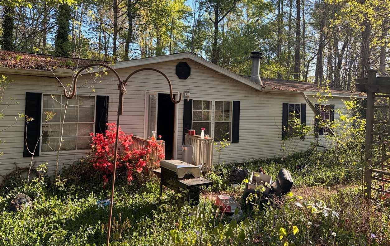 This property has significant deferred maintenance that buyers must factor into due diligence and renovation budgets. The roof needs full replacement and the HVAC is non-operational — wood heat only is currently being used. ⚠️ Major active water leaks in bedrooms 1 and 2. ⚠️ The primary bath has soft, unsafe flooring at the entryway — seller had covered it with papers and weights. ⚠️ The entire right side and back of the home are overgrown with vegetation, gutters are clogged and partially detached, and large trees surround the structure. The multi-level back deck and two 10×10 outbuildings are barely accessible and covered in growth. A creek runs along the lot border at the bottom of the hill — strong landscape potential once cleared.